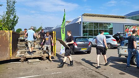 Een team van Klimaatkrachtig Delfland, Gemeente Westland helpt met het tillen van de tegels. Heb je vragen over duurzaamheid? Dan gaan zij graag met je in gesprek.